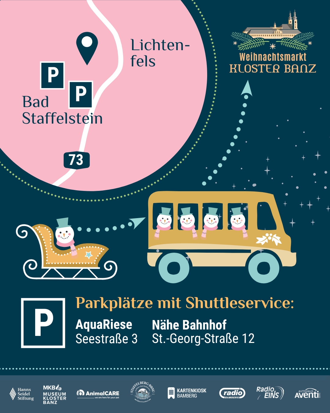 Auch Besucher, die mit dem Zug anreisen, können den Shuttlebus bequem nutzen. Steigen Sie einfach an der Haltestelle am Bahnhof ein und schon geht es direkt weiter Richtung Weihnachtsmarkt Kloster Banz.